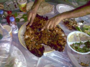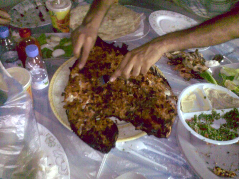 We took our table, which the waiter covered with two plastic sheets Arabian-style. We started with hors d’oeuvres, hummous, tabouleh and the most delicious flat bread which they baked on the premises. Then the fish arrived. The prawns were barbecued with a delicious yogurt and herb sauce. Then came a plate of maid, grilled with little embellishment – very delicate white flesh – delicious. Finally, the yanaan. Cooked as you would a sole, but with a thick crust of spicy vegetables – chunks of flesh coming easily off the bone, similar to sea bass.