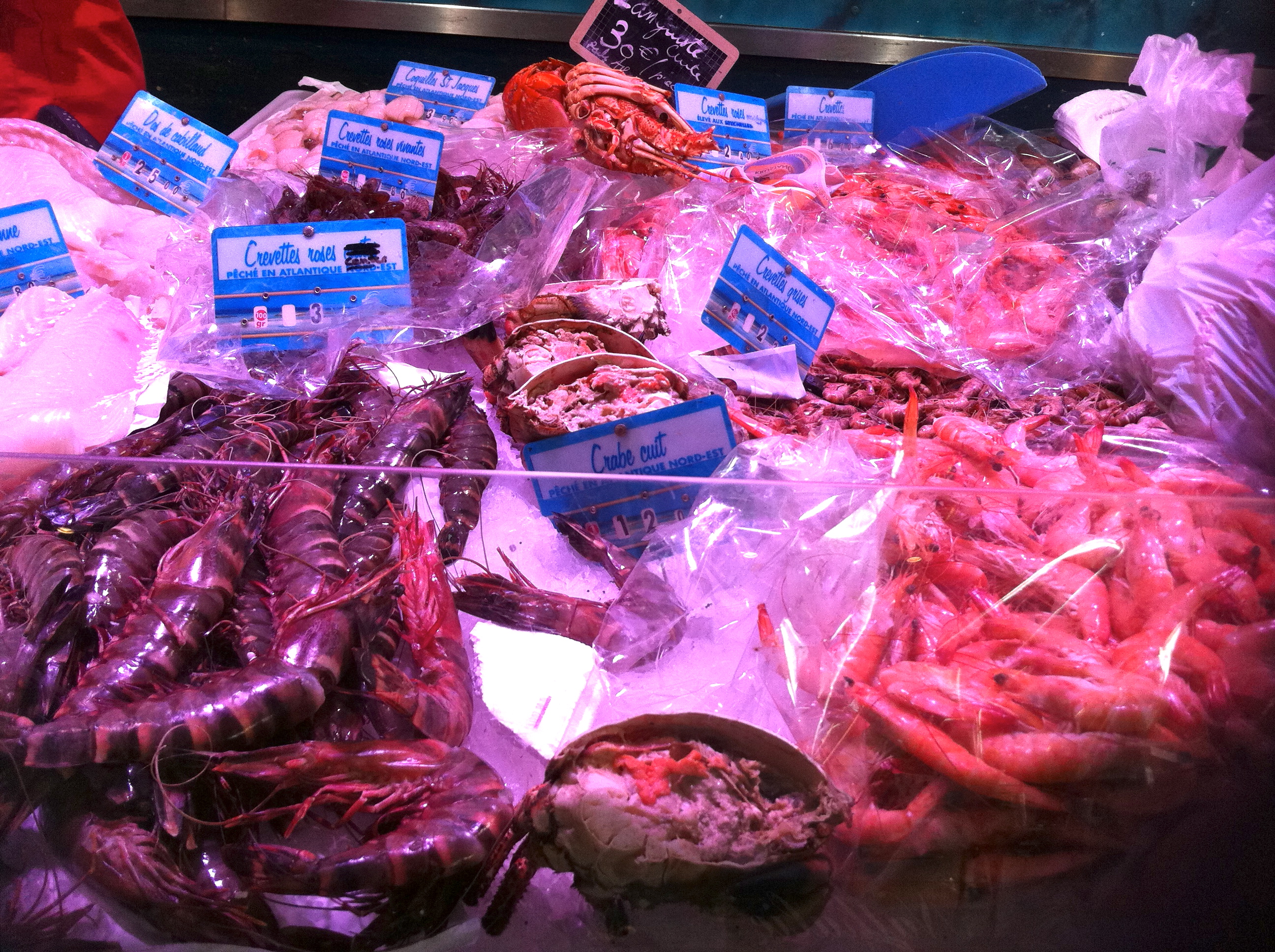 Whatever your nationality or social status, a visit to the market is obligatory. It’s easy to find. You just follow the stream of old ladies with empty bags, or those returning with fresh baguettes. Many French towns have open-air markets once or twice a week. In La Baule it was open every day. Stalls selling clothes, shoes, second-hand books, oriental carpets and roasted chickens on spits. Bars, cafes, patisseries and charcuteries. And in the centre, the permanent food market that reminds you that there are alternatives to antiseptic supermarkets. Counters full of gleaming fruit and vegetables. Others packed with examples of the exotic ways in which the French use every piece of an animal that can possibly be eaten. Pigs trotters, foie gras, tongues, intestines and brains. Finally, since this is a seaside town, seafood counters with bright-eyed fish, oysters, crabs, tanks of mussels and piles of live lobsters squirming in indignation at the string binding their massive claws tightly together.