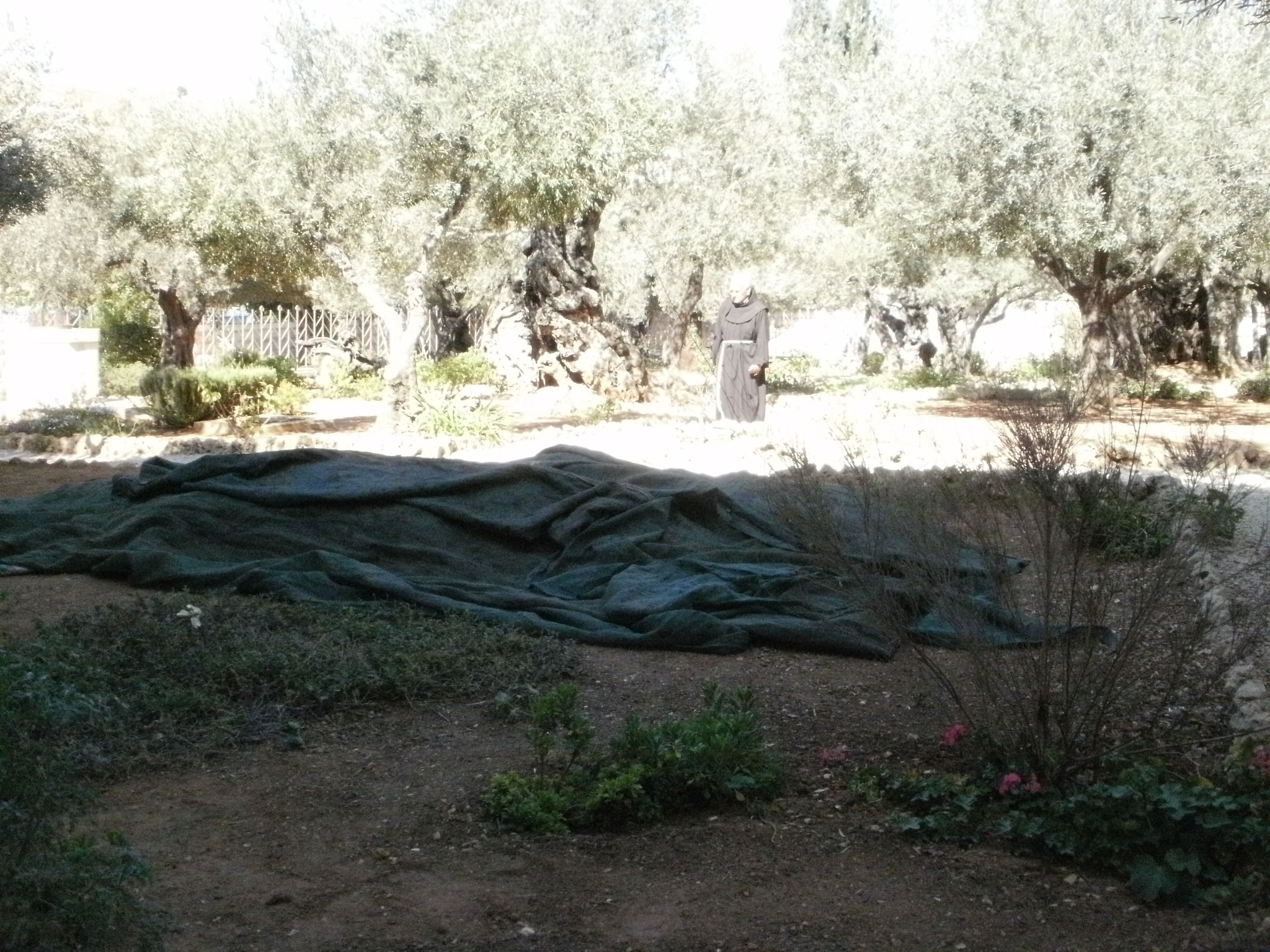 After photos, we descended to the Garden of Gethsemane, where we met our first street sellers, offering beads, trinkets, water and postcards. As instructed we ignored them, even though I didn’t get the impression that we were about to mobbed by voracious pickpockets. Inside the walled Garden, we wandered past an unremarkable church to a small fenced enclosure circled by a few ancient olives and patrolled by a fierce-looking monk who reminded me of one of those slightly unhinged characters you encounter on a bus from time to time – make eye contact and you’re doomed to an impassioned tirade about aliens.