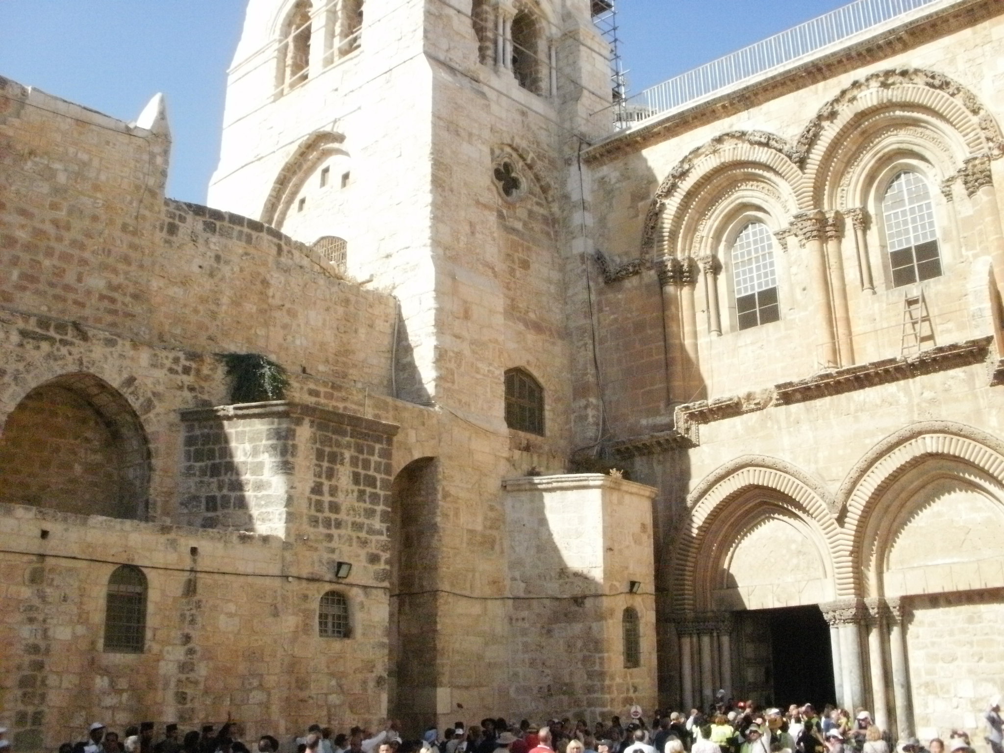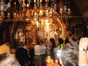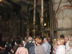 I love souks, and I could happily have spent hours in the shops lining the Via Dolorosa, but it was not to be. We were moving towards the Church of the Holy Sepulchre. The church sits not on some impressive hill, but as one of a number of tall buildings accessible through winding alleys. There is a small square in front of it, which was packed with the faithful queuing to get inside. The interior is dark and gloomy. What little light gets in comes from grimy windows and from the top of the dome that covers the alleged site of the tomb. For centuries the Catholic, Orthodox, Coptic and Armenian churches have vied with each other for the guardianship of the church, and for their little piece of the building, often coming to blows, and neglecting the maintenance of the building because of disputes over responsibility. Exceptionalism at work again.