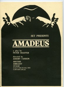 I neglected to say that the British Embassy, when it was in Jeddah, boasted a large stage in its grounds. Several times a year, an amateur dramatic society, to which I belonged, put on plays in front of audiences of hundreds. It was there that I did my first acting since university. We did all manner of shows with large casts, ranging from Shaffer’s Amadeus to Shakespeare’s Romeo and Juliet.
