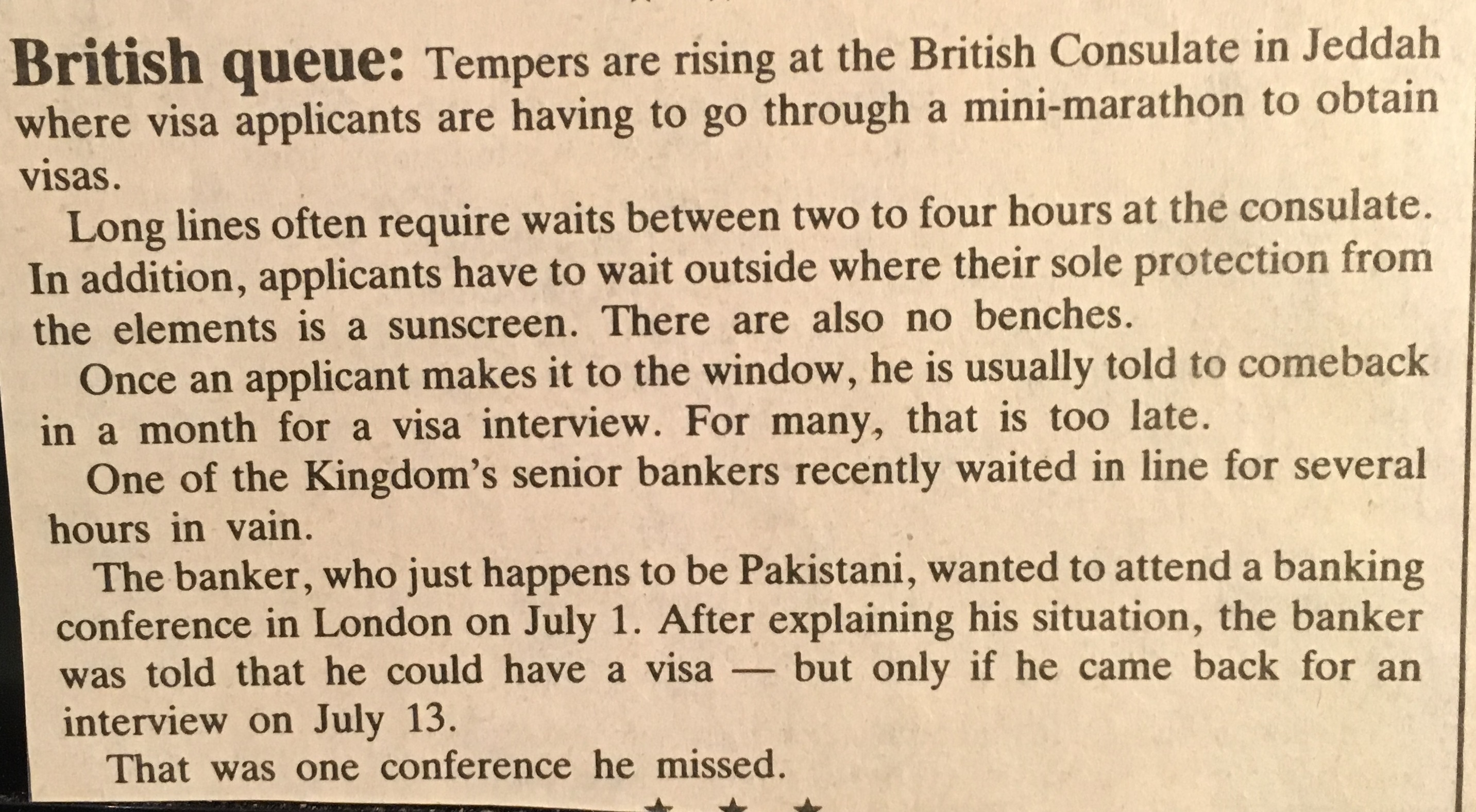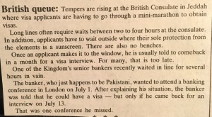 His successor was not so deeply appreciated, partly because of his unfortunate habit of nodding his head violently when making a point. This was highly counter-cultural. Saudis, used to keeping their heads still for fear of losing their ghutras, thought he was rather undignified. Little things make a difference in diplomacy, I guess. Moral of the story: don’t appoint a moorhen as ambassador to a Middle Eastern country.