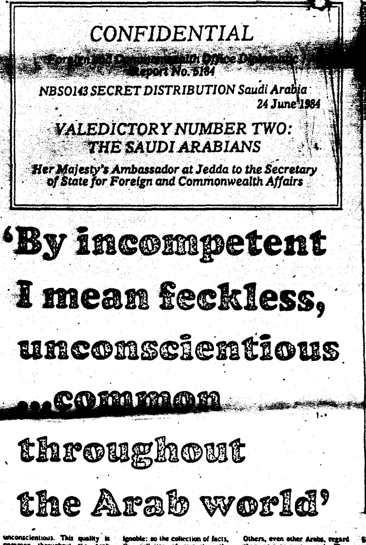 All these activities were serenely presided over by the ambassador. For the early part of my time in Jeddah, he was Sir James Craig, who died recently. Before he left, he wrote a scathing end-of-term dispatch to his masters in London about his posting, in which he accused the Saudis as being “feckless, incompetent and unconscientious”. It was supposed to be confidential, but someone leaked it. And of course, copies were smuggled back to us in Jeddah, much to our delight. Not that we agreed with him, you understand.