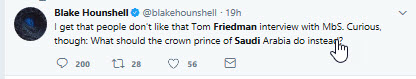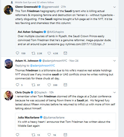 As for the interview itself, Friedman is widely accused of writing an apologia for MbS, or, in the words of one tweet, delivering a warm french kiss to the crown prince. Here are a few comments to be found on Twitter on publication day: