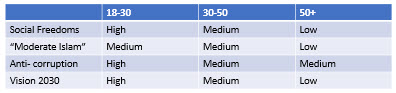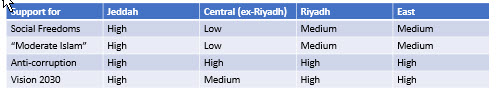 So here’s a broad-brush view, based on my experience and observation, of the support, or otherwise, of the Crown Prince’s domestic initiatives.