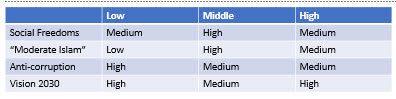 - Authoritarian rule: with social liberties, as in the UAE, curbs on corruption, curbs on religious extremism, clampdown on dissent across the spectrum. Potential risks: passive resistance on the part of the disenfranchised – particularly the religious establishment – leading to active insurgency. Resentment among the marginalised factions within the royal family, especially those who have been targeted in the recent anti-corruption drive, and those who maintain close links with their former military fiefdoms.
