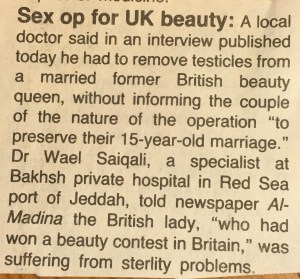 Typically, Tuesday’s copy of the Arab News devotes several features to medical breakthroughs. In a country where officially homosexuality and drug abuse are non-existent, the plight of the hapless blood recipient receives most attention, since this is the only explanation given for the spread of AIDS in the country.