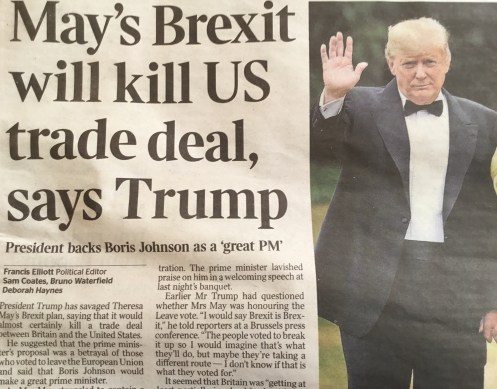 Though Trump was not in either aircraft – I subsequently discovered that their job was to “support” Marine 1, Trump’s helicopter, presumably with a company of marines armed to the teeth with weaponry of all shapes and sizes – I fancy that he would have appreciated the plain speaking from Brits who he believes like him a lot.