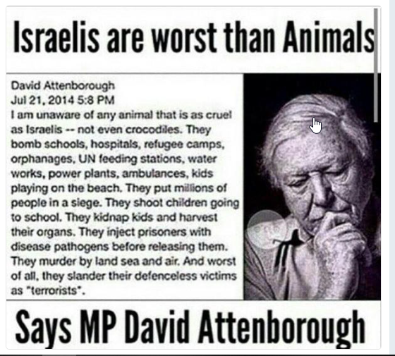 I’ve no idea where the words come from, but apart from picking out the absurdities – of which the worst is the idea that Britain’s beloved national treasure would claim that calling Israel’s enemies terrorists was worse than injecting them with pathogens and harvesting their organs – it’s worth taking a look at the route whereby this billet doux came to me.