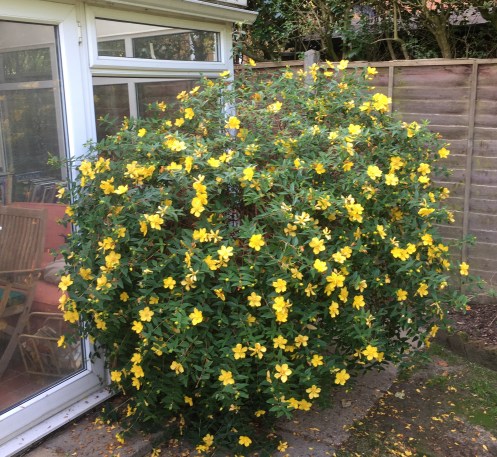 Nearby, almost blocking one side of the conservatory, sits a big fat bush in full bloom with a multitude of yellow flowers. The blooms are spectacular, if slightly manic, but I don’t like the bush encroaching over the path and blocking my view of the rest of the garden when I escape to the conservatory.