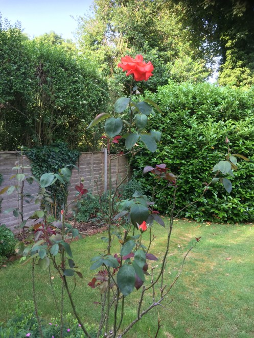 I’ve written lately about the five rose plants which we bought last year, and which at various times since then have fought for my attention on the patio. I call them Boris, Priti (formerly Theresa), Dominic, Matt and Keir.