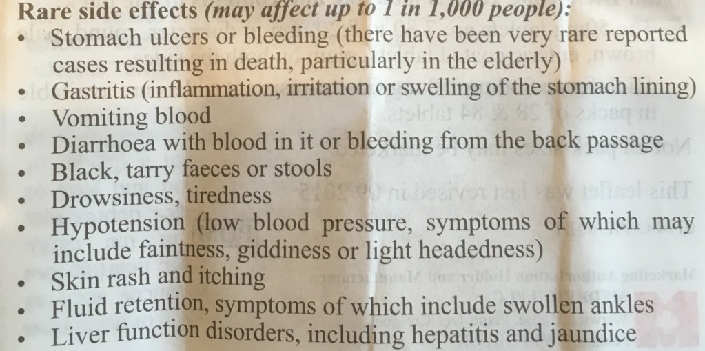 Apart from leaving us all convinced we’ve been infected, and reaching for every medication under the sun, the virus provides one additional benefit to the pharmaceutical industry. You’ve probably scrutinised one of those sheets of paper (as above) that come with most medicines. You know the ones. They list all the possible side effects of the drug you’re about to take: epilepsy, necrotising fasciitis, lethargy and pink spots on unlikely parts of your body.