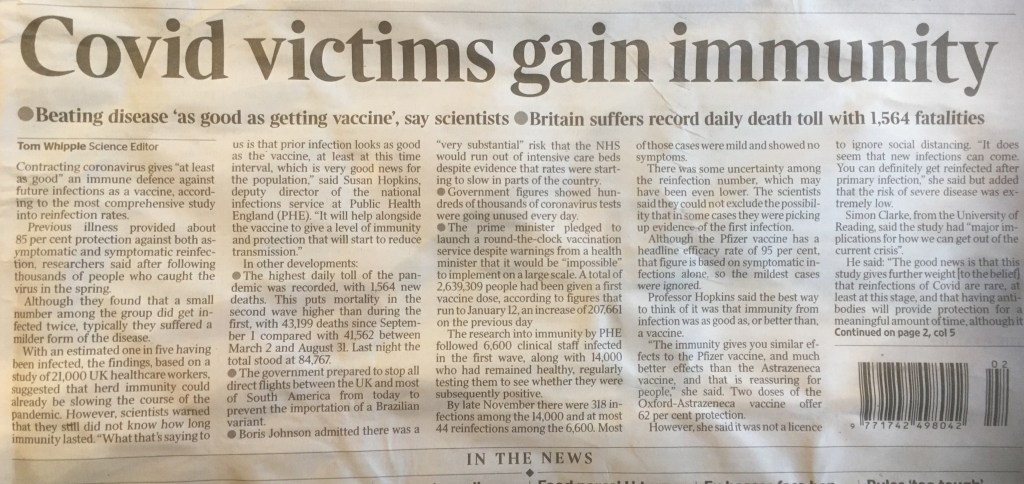 As I sat this morning draining my second cup of coffee, I came across an article on the front page of The London Times. It was about how if you’ve had COVID, you have an 85% chance of being immune to reinfection – for the time being at least. That, apparently, gives you a better chance of staying well, (assuming of course that you are well) than the AstraZeneca vaccine, two doses of which give you 62% immunity.