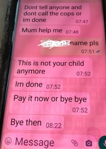 The scammer used a UK phone number, which has no doubt now disappeared. The language suggested that they were in the UK, or at least using British idiom. If they’d been American, they would probably addressed the text to Mom. The “tell no one, no cops” routine was straight out of a second-rate TV kidnap drama.
