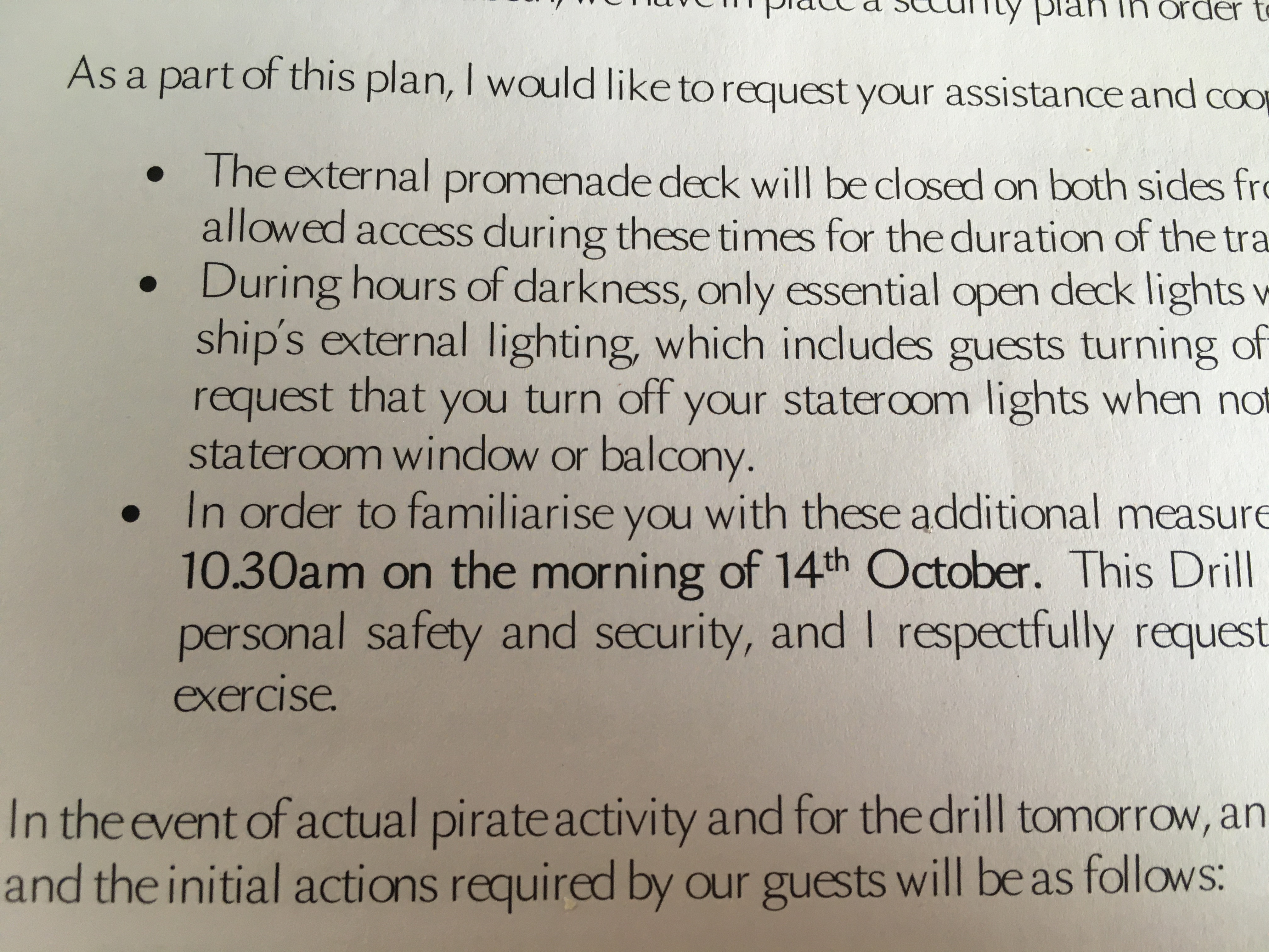 In the unlikely event that a boatload of pirates tries to take over a ship with 2,500 passengers and crew, I would hope that we have a few RPGs and people who know how to use them, as well as the legendary sonic gun that blasts out the eardrums from 200 metres. And of course, there’s the international anti-piracy task force patrolling the area, who would no doubt send their helicopters to the rescue if needed. My theory: it’s all for insurance purposes.