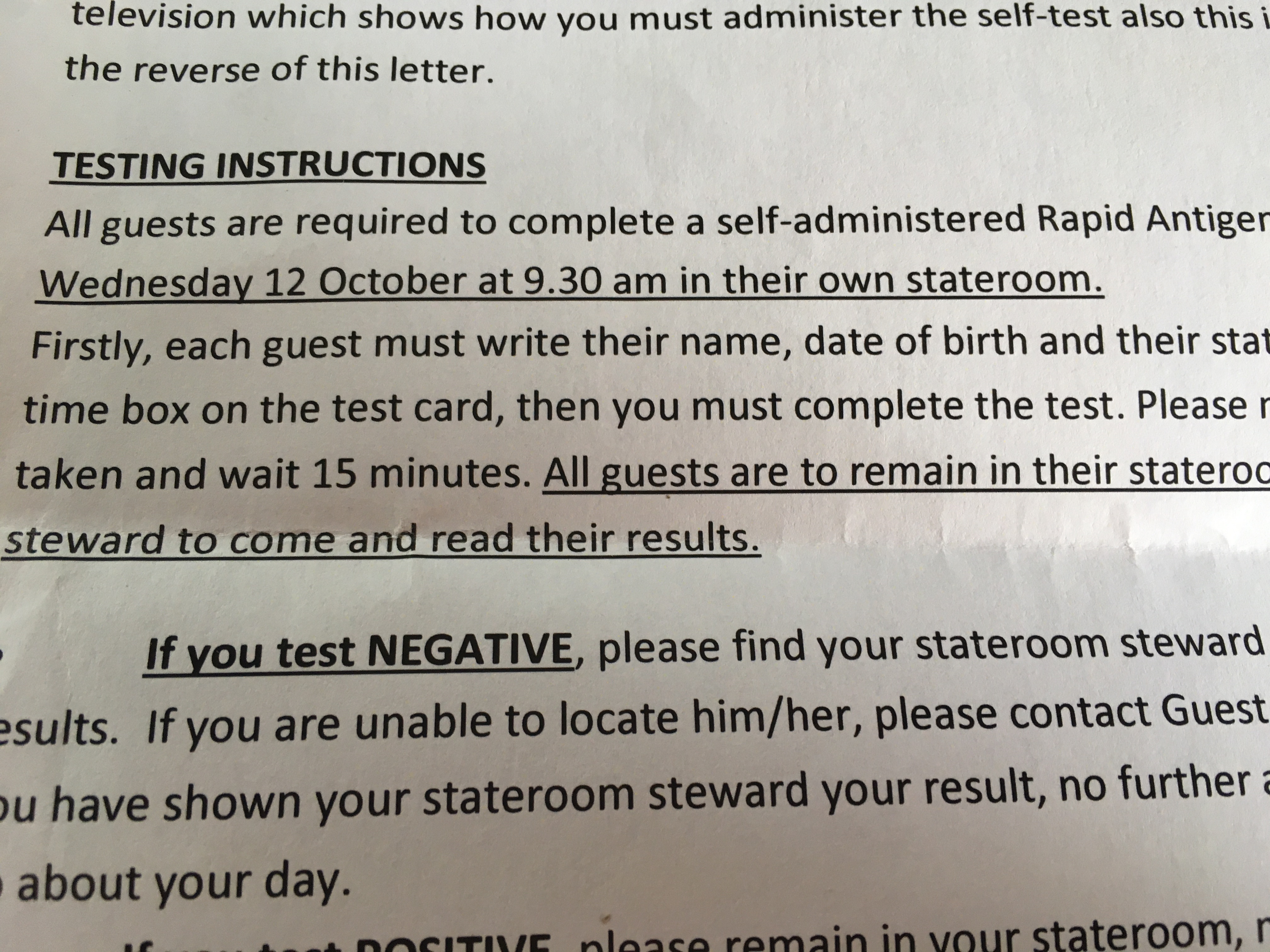 During the day, we were all asked to do a lateral-flow COVID test. Those who test positive will be isolated in balcony rooms just beneath our deck, where they can cough and splutter to their hearts content in the open air. Doesn’t bode well for those of us who might be taking the sea air at the time, since you would expect the virus-infested air to drift upwards…. Nobody was allowed out of their rooms until they’d done their test. I later learned that a number of people tested positive.