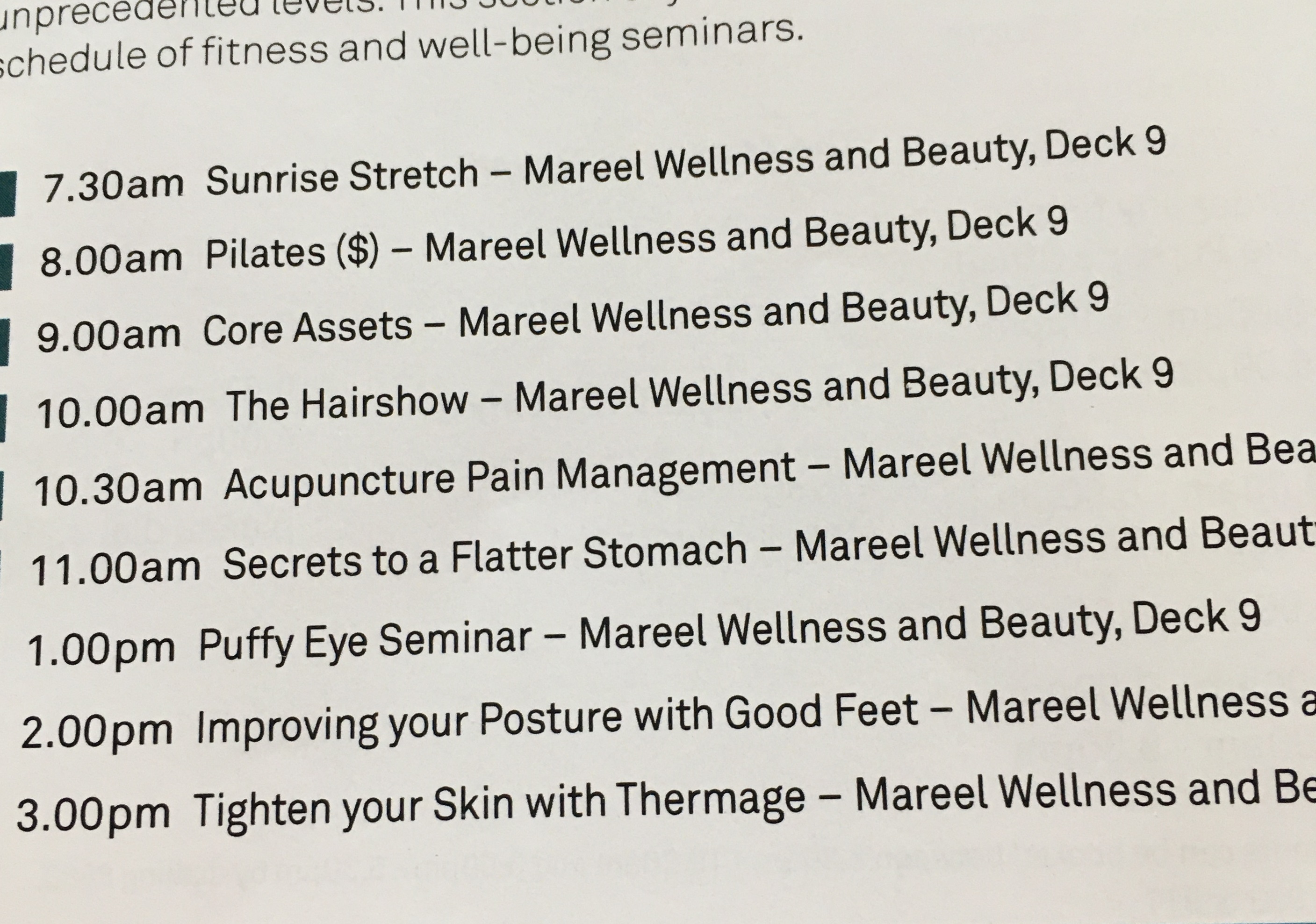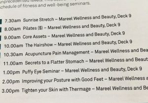 It’s a shame, in a way, that we don’t have technology on board that allows us see other people at the age of their choosing. Instead of the person in front of you at the age of eighty, face and much else besides sagging towards the floor, how much better if you could see them, say, at thirty, in the full vigour of youth yet with incipient maturity. I say this because it’s quite depressing to look at the hordes of seniors on the ship. Faces betraying what looks like disappointment, disapproval or just blankness. Gait that suggests a lifetime of toil, though more likely the result of years of obesity. Bodies that spread out over two seats, so vast that they begin to envelop the relatively tiny heads that perch on top of them.