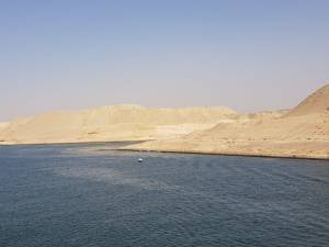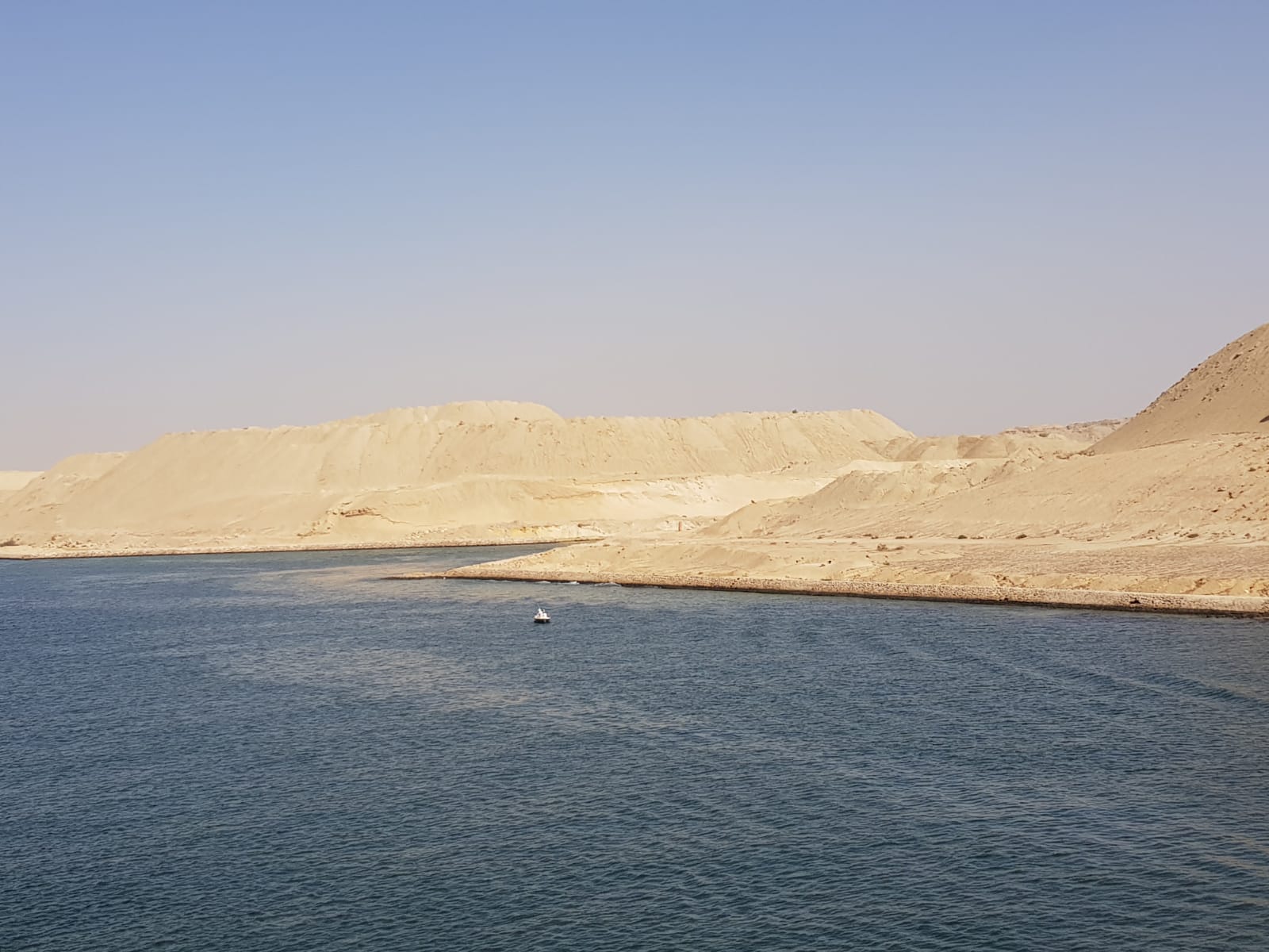 Early in the morning, we glide into the Suez Canal. So this is what we fought a war for in 1956. Doesn’t look like one of the seven wonders of the world, but this little waterway carries a serious amount of the world’s maritime cargo. Fertile, irrigated fields on one side. Scrubby wasteland on the other. Down in the water, we pass a fisherman in a small boat who shouts “welcome”. To his canal, not ours.