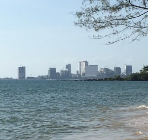 So what the hell, you may ask, are we doing in the middle of a construction site? Fortunately there are a few places where you can still escape the dust and the din, and that’s where we are. You can still hear the clanking and sawing as a background noise, but it’s distant enough to be able to filter out. The sea’s close by, even if you have to march past a shanty town of tattoo parlours, bars and minimarts to reach it. There you will see a contrast in vistas. Look left, and you will see dreamy green islands. Look right, and the concrete inferno shimmers on the horizon.