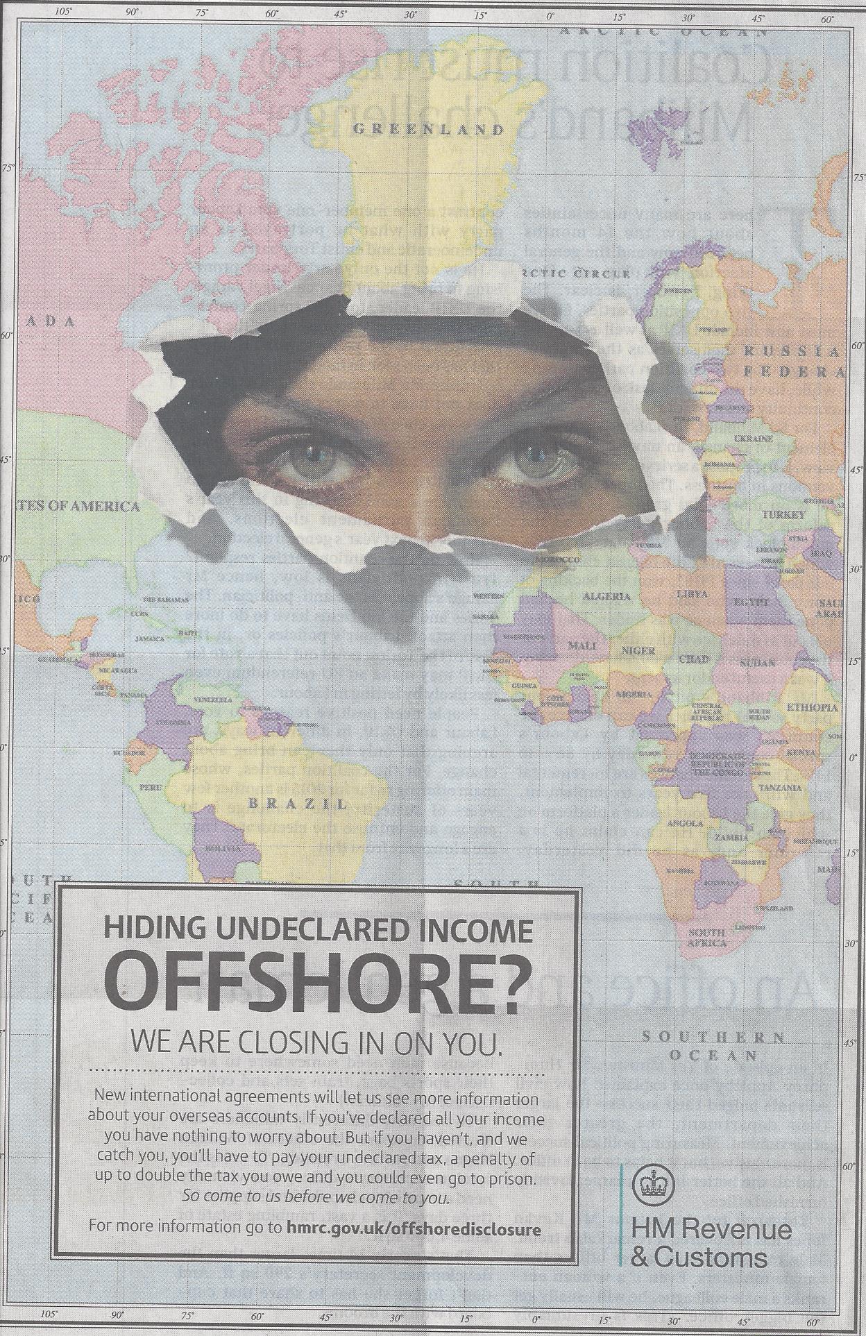 Apart from the ethnic and religious overtones of the woman’s picture (assuming she is a woman), it’s a pretty unsubtle message. I wonder who will respond to it by coming out with their hands up. Can there be anyone with sufficient funds offshore to warrant the HMRC’s attention who is not aware of the rules and penalties around undeclared offshore income – apart that is from gullible comedians, footballers and actors who place their trust in sharks who devise allegedly rock solid tax avoidance schemes characterised by their cynicism and amorality? Apparently there are. HMRC claims to have raised £600 million from tax evaders in the last financial year.